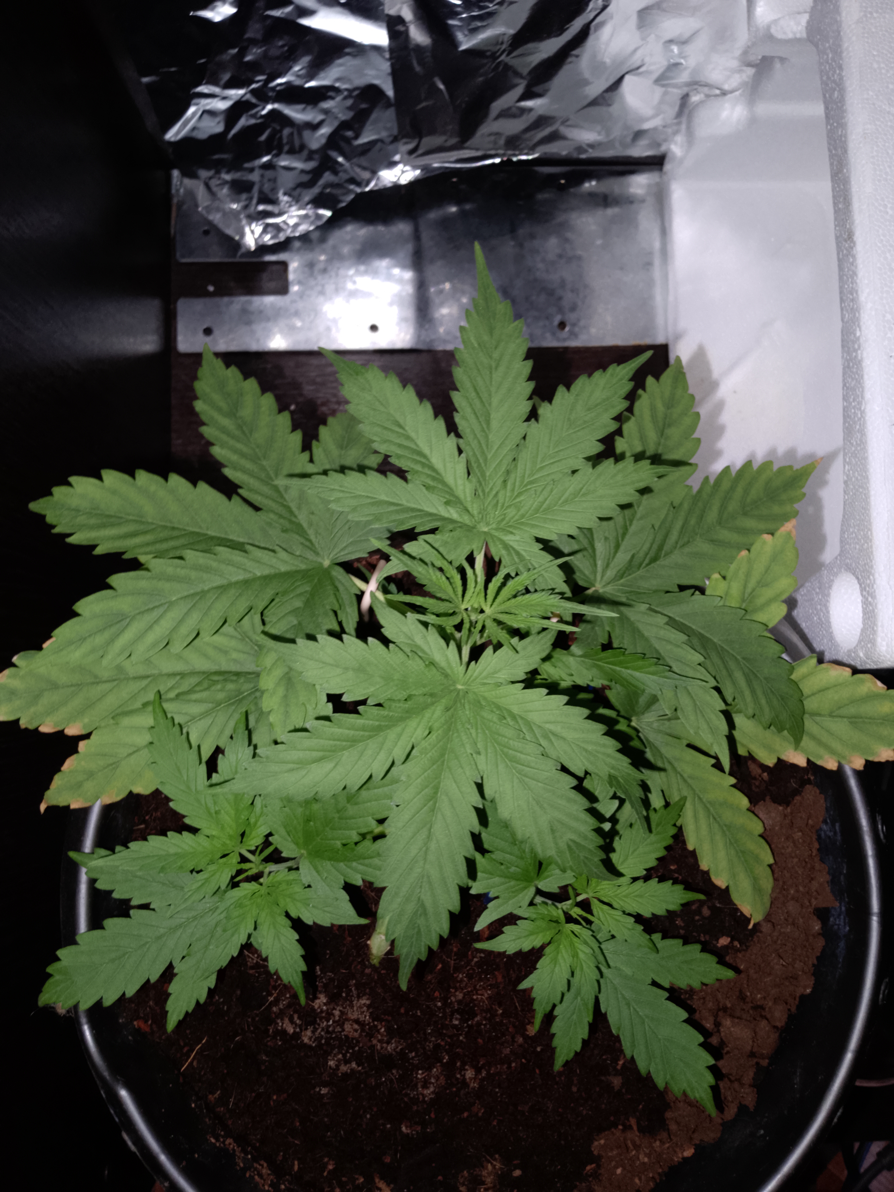 Получил два ореха бонусом. Одно решил поднять. С первых дней удивила своей живучестью. Вылезла на следующие сутки, как была прикопана. Реально, я таких лапухов ещё не видел. Может с грунтом угадал. Растёт, как на дрожжах. Темно- зелёная ботва огромных размеров. На третьей недели загнул. Она и не заметила. Боковые колы выстрелили. На четвёртой неделе вышла на предцвет. Пишу отзыв, потому что обещали ништяки). Переплюну конечно, но ожидаю хорошего урожая. При этом не сильно высокая, её больше вширь распирает. Растянул по всему горшку. Поливать даже не слишком удобно. Один недостаток лично для меня: сильный запах, отдаёт выхлопом. Пришлось новый фильтр заказывать. Когда срублю девку, отпишусь о впечатлениях. Всем удачного грова!